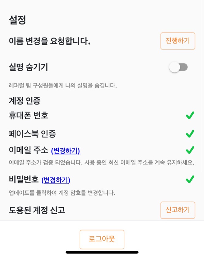파이 가입 후 14일 지나신 분은 아래와 같이 이름이 정상적으로 등록되어 있는지 확인하세요.