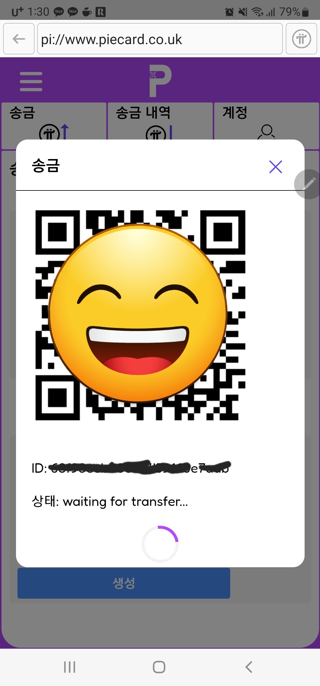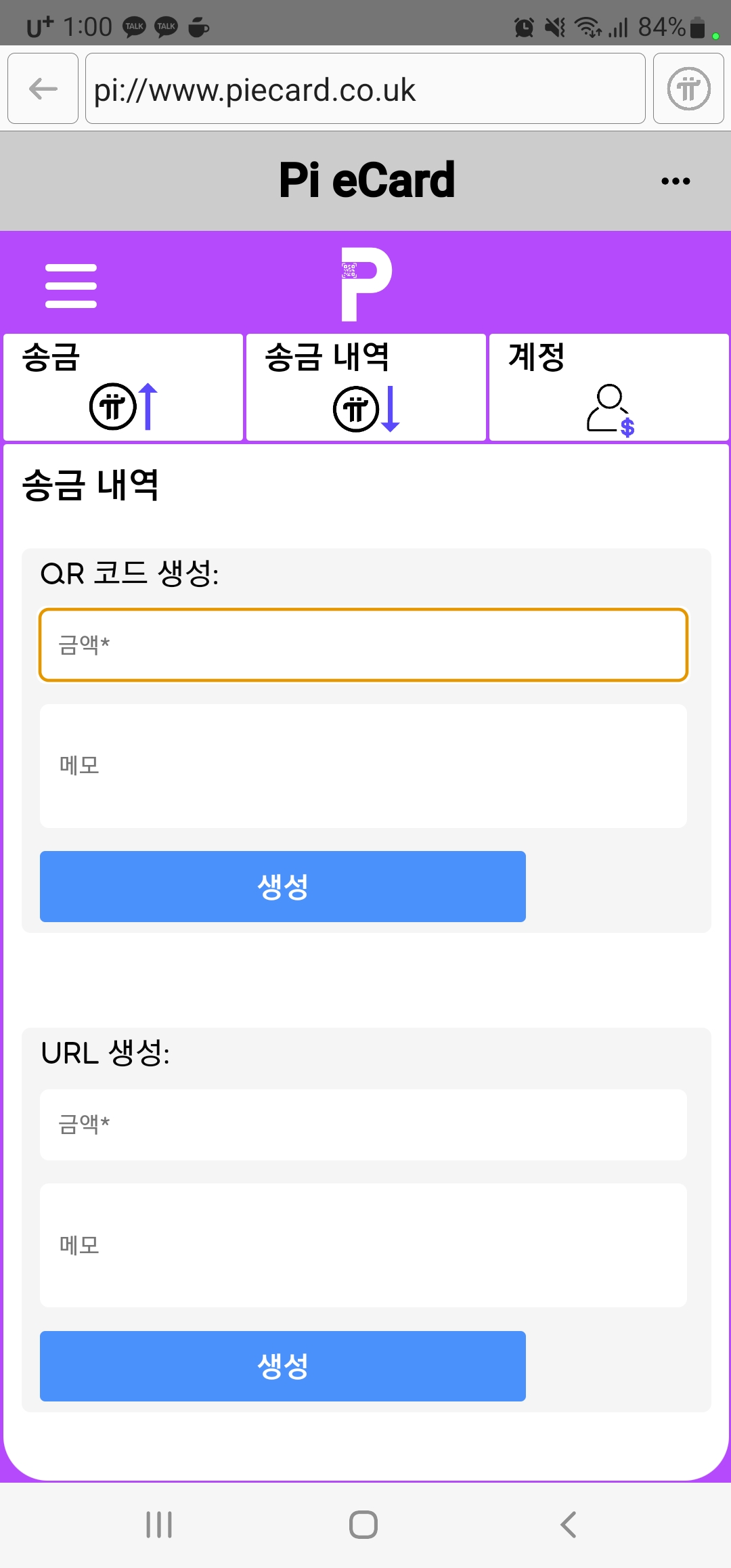 받을 사람은 받을 금액(파이개수)을 입력하고 "생성"을 눌러 큐알코드를 생성합니다. 필요시 메모 입력가능