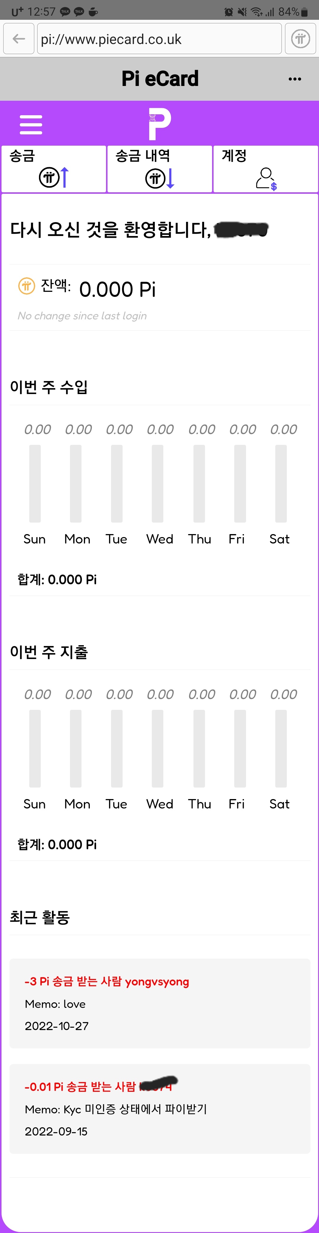 ("비빌번호 로그인 활성화"는 추가로 e카드 비밀번호를 설정하는 기능입니다. 설정은 자유이며, 설정하면 크롬 같은 일반 브라우저에서도 충전된 파이를 송금 가능합니다.)