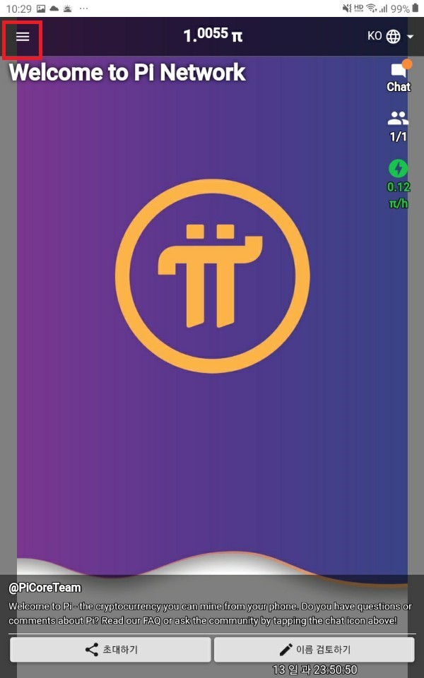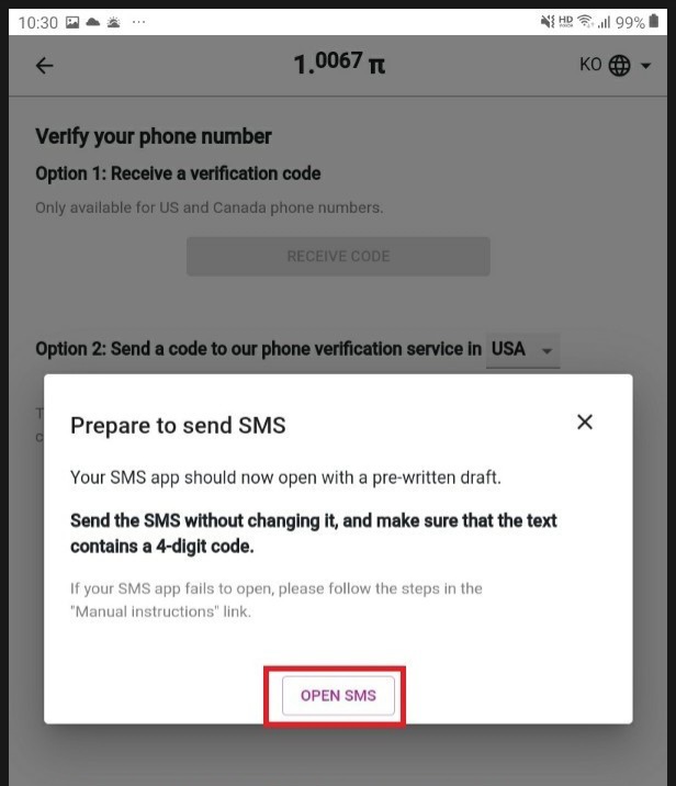 휴대폰 번호 인증 절차는 입력된 4자리 숫자를 전송하는 방식이며, 파이앱 계정복구, KYC인증을 위해 필수로 해야하는 항목이다.