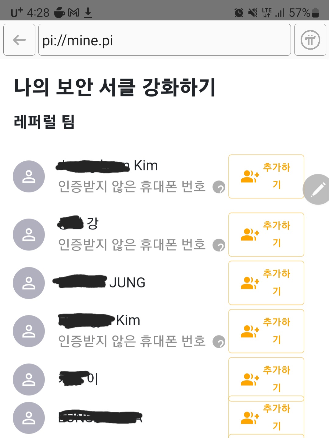 파이 가입된 전화번호를 휴대폰에 추가하고 돌아오면 파이마크가 표시된 사람이 생긴다. 이사람을 보안서클에 등록 가능하다.