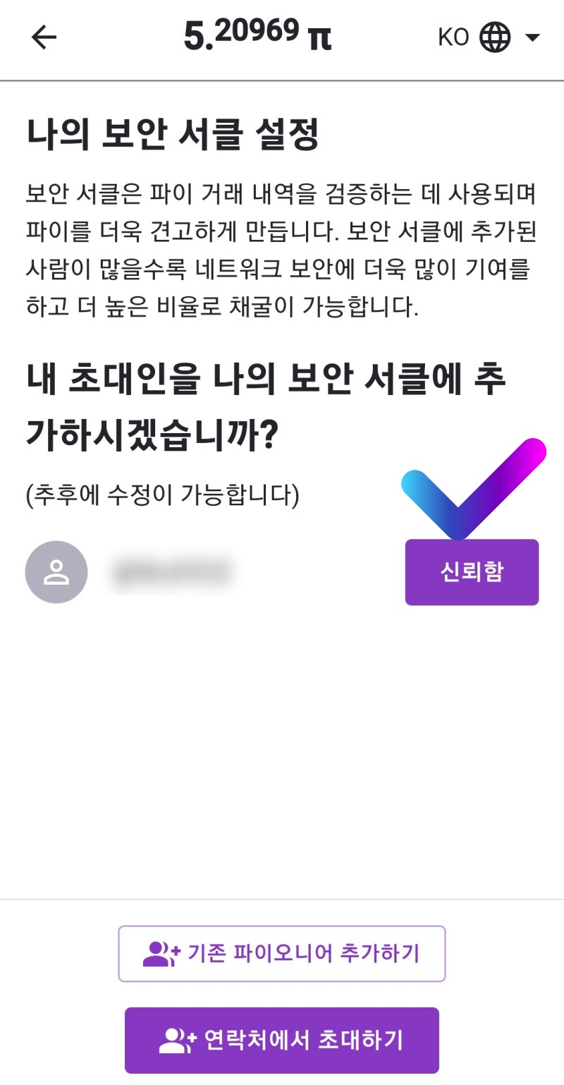 니머지 4명은 기존 파이오니어 또는 연락처에서 초대하기 선택하여 총 5명 설정한다.(이왕이면 가족 지인 중 KYC 및 휴대폰 번호 인증자가 좋음)