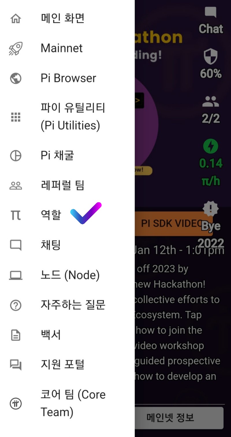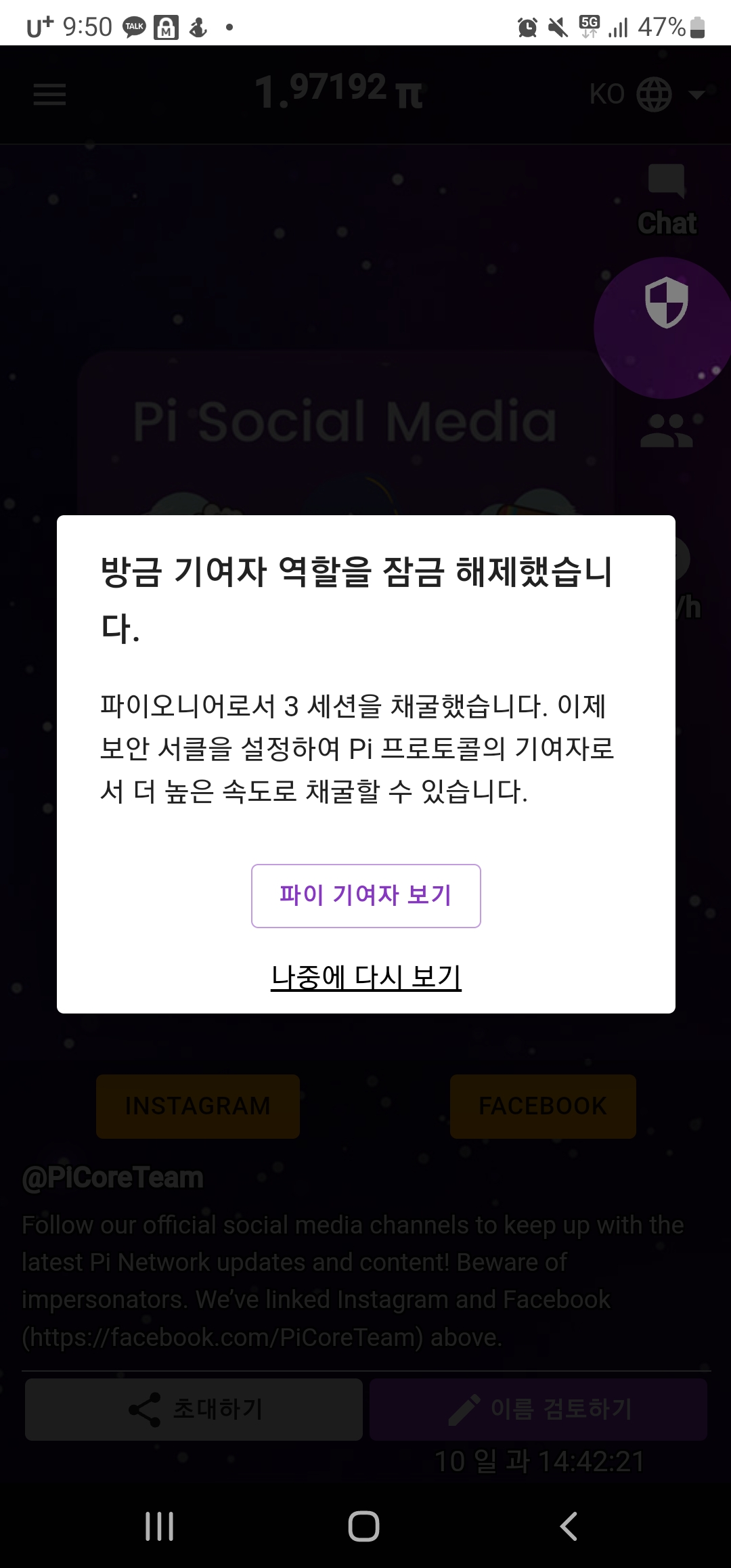 ^ 설정하면 채굴앱에 방패 모양이 생긴다. 아래 그림은 3명만 설정되어 60% 적용된 상태일 경우이다