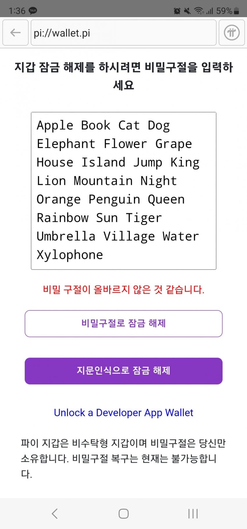 파이전송 또는 디앱 연동시 반드시 지문을 사용하시고 비밀구절은 디앱 어디에도 입력하지 마시기 바랍니다.