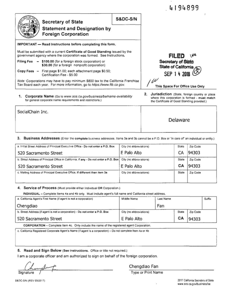 2018년 9월에 'Social Chain INC' 비즈니스 등록.